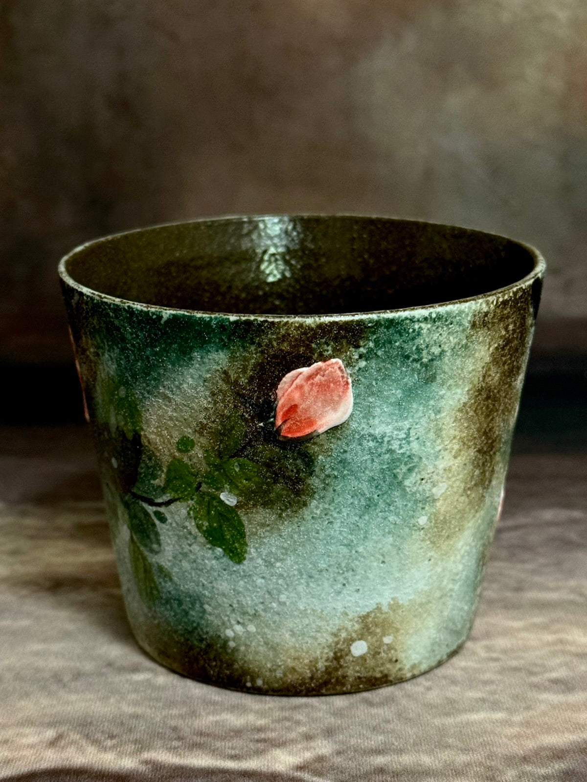 This Mist Veil & Orange Hibiscus Hand Cup draws inspiration from Hawaiian rainforest gardens at tropical afternoon—where soft green mist lingers among the foliage, orange-red hibiscus blooms burst from the leaves like embers, and the air is thick with the sweet, warm scent of the tropics. Its dark green misted base mimics the hazy glow of sunlight through rainforest leaves, with raised hibiscus flowers that look like they’re blooming boldly in the dappled light. The curved cup shape fits perfectly in your palm, making every sip feel like holding a little piece of a secret tropical garden, a reminder that life’s brightest joys come from blooming freely, just like this hibiscus in the mist.